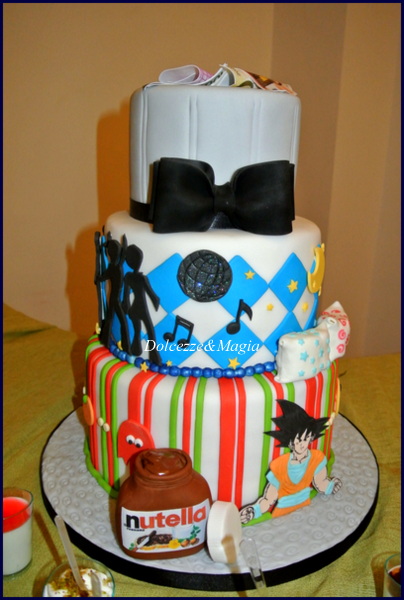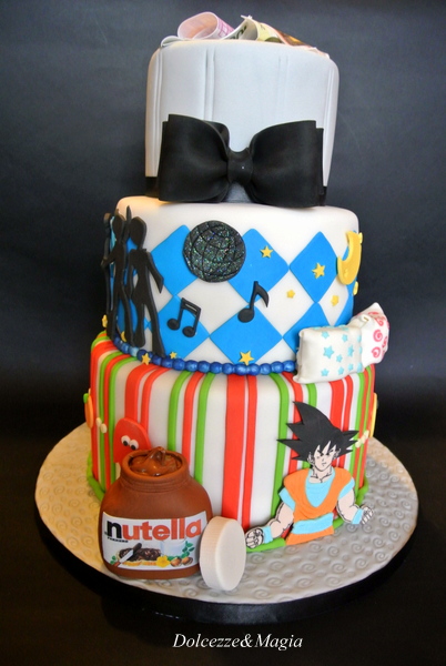 A life cake, tre piani di torta con cui ho cercato di spiegare le passioni di mio nipote fin da quando era piccolo.