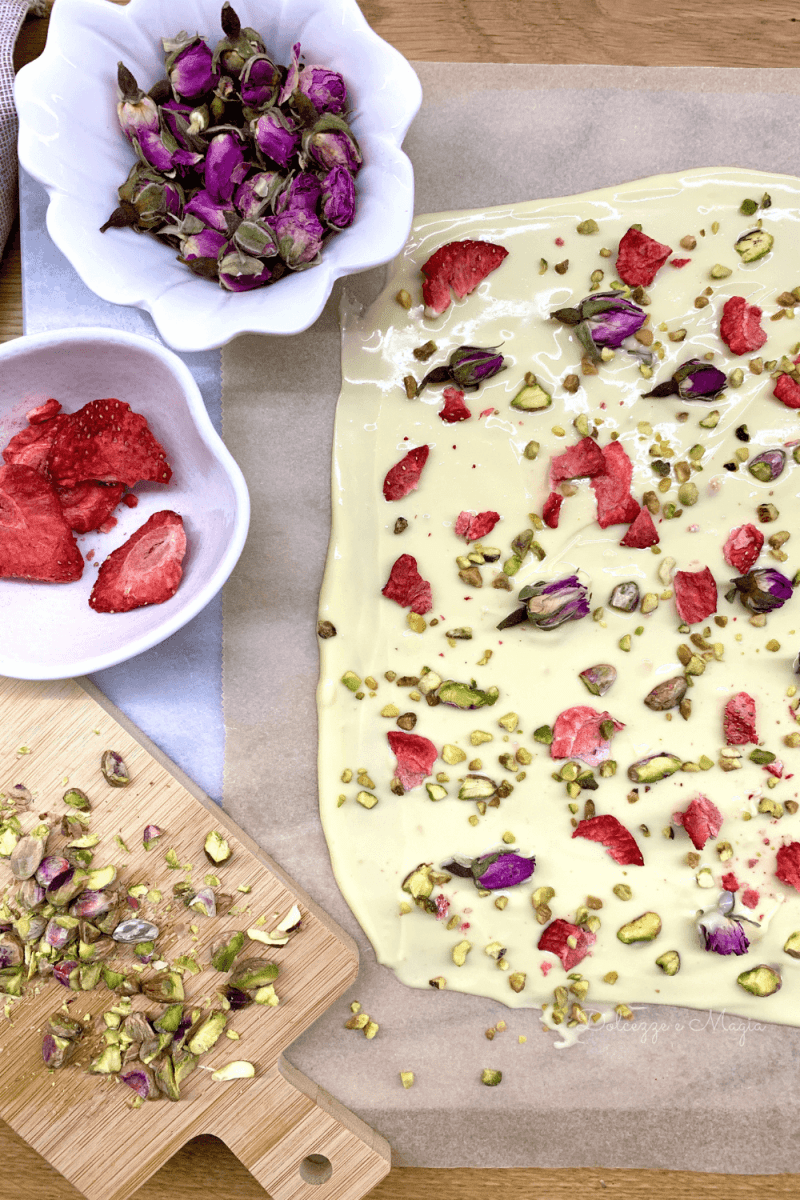 Queste barrette sono il connubio del cioccolato fuso e degl’ ingredienti decorativi che scegli di usare. Io, ispirandomi a un pin di Pinterest che ti lascio qui, ho optato per boccioli di rose essiccati molto profumati, fragole disidratate e pistacchi, un insieme d’ingredienti che ricorda la primavera e ha in sé una certa gentilezza naturale che bene si associa alla mamma e al mese in cui viene celebrata. Prepararle è davvero semplice.