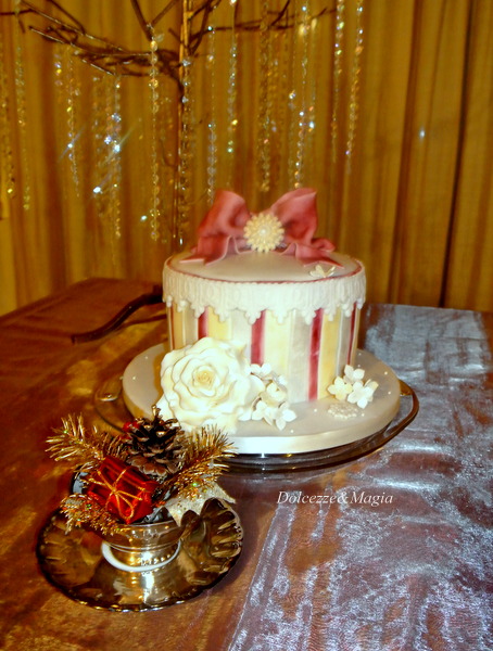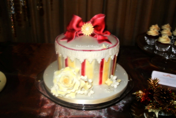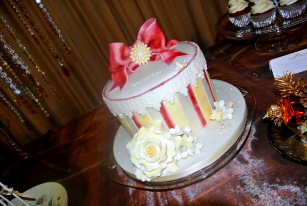 Una torta dai colori tenui: panna, champagne, argento e rosso ciclamino, ispirata alle creazioni di Cotton & Crumbs, era il centro dello Sweet Table