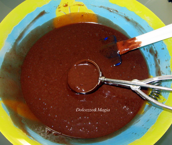 Adesso potete mettere l’ impasto nei pirottini. Io mi aiuto con un ice cream scoop, è veloce e pulito, e ogni pirottino riceve la stessa quantità d’ impasto, ma due cucchiai andranno benissimo!