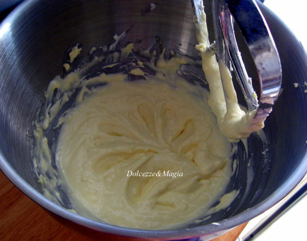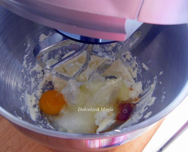 Aggiungete il resto degl’ ingredienti, zucchero, uovo ed estratto di vaniglia e impastate a velocità media finchè non formeranno una crema liscia e consistente