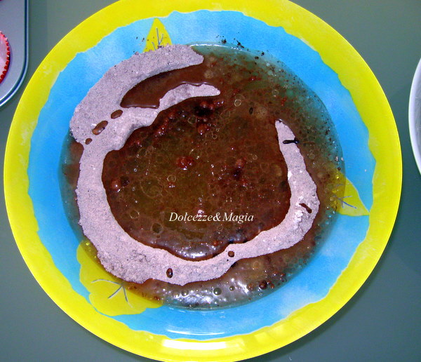 In una ciotola capiente mescolate tutte le polveri insieme e in un’altra fate la stessa cosa con i liquidi, dopo di che unite le due cose, così