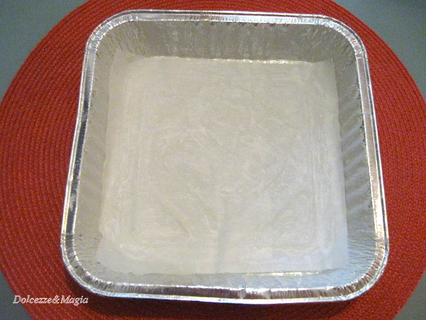 Accendete il forno a 180°, imburrate una teglia quadrata di circa 20cm x 20cm e foderatene la base con un ritaglio di carta forno.