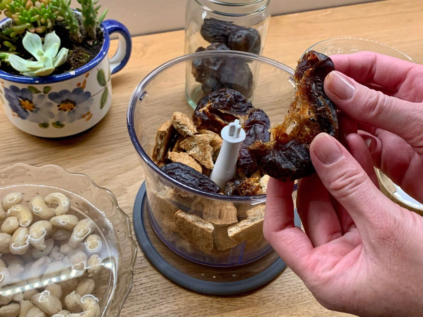 - In un frullatore metti i biscotti spezzettati e i datteri privati del nocciolo. Frulla fino a raggiungere una consistenza sabbiosa e appiccicosa.