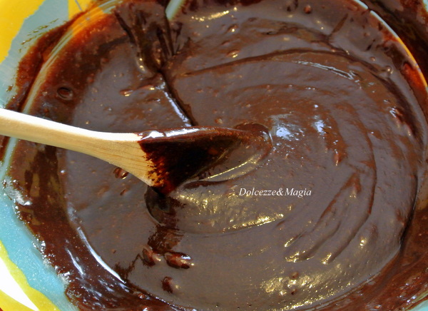 l’ impasto si staccherà facilmente dalle pareti e sarà molto denso. Prelevatene circa 1/2 tazza e mettetela da parte, versate il resto del composto nella teglia foderata con la stagnola e mettete anche questa da parte.