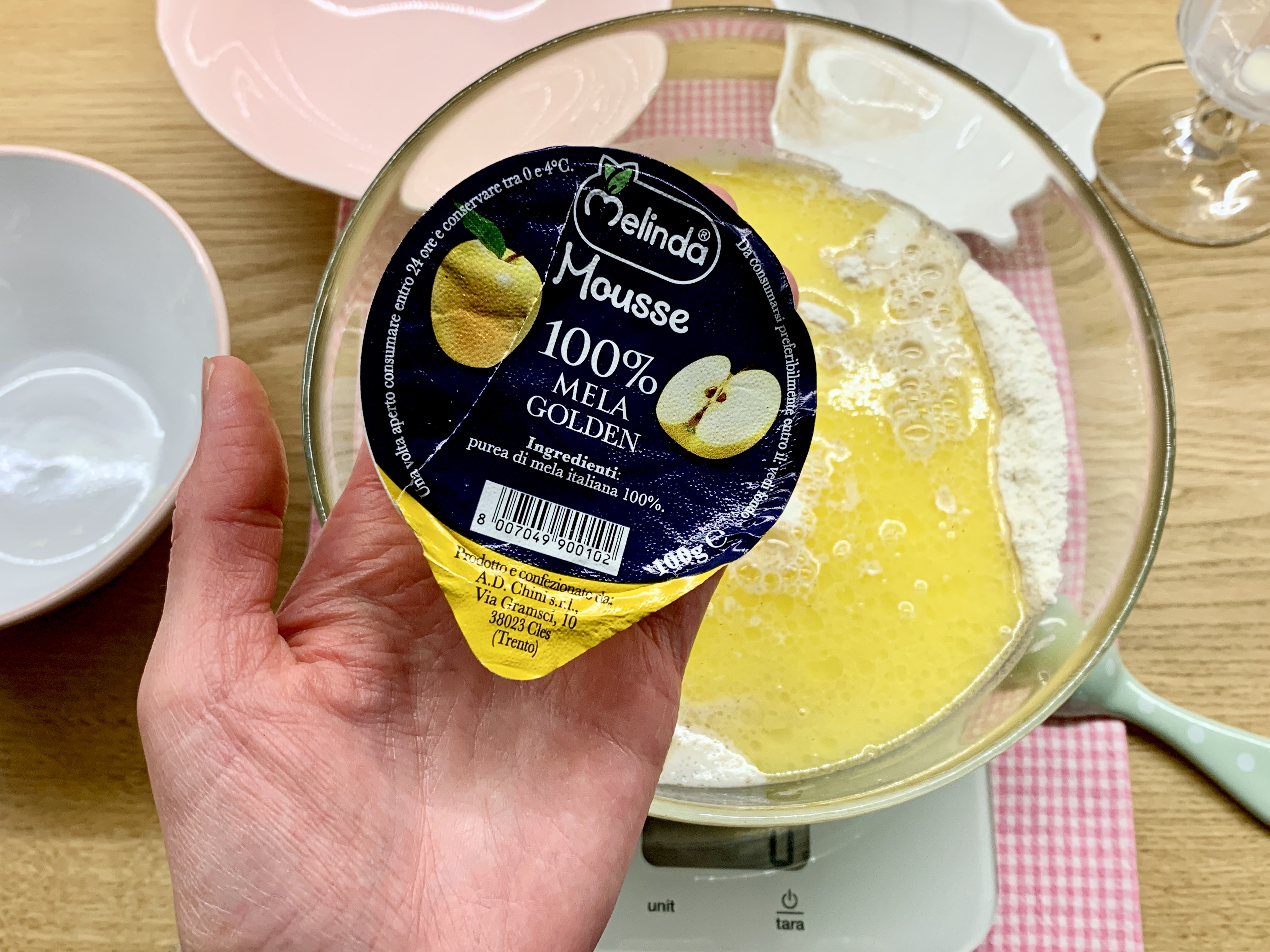 Mescolate le polveri, aggiungete i liquidi e infine l’ingrediente segreto … la purea di mela.