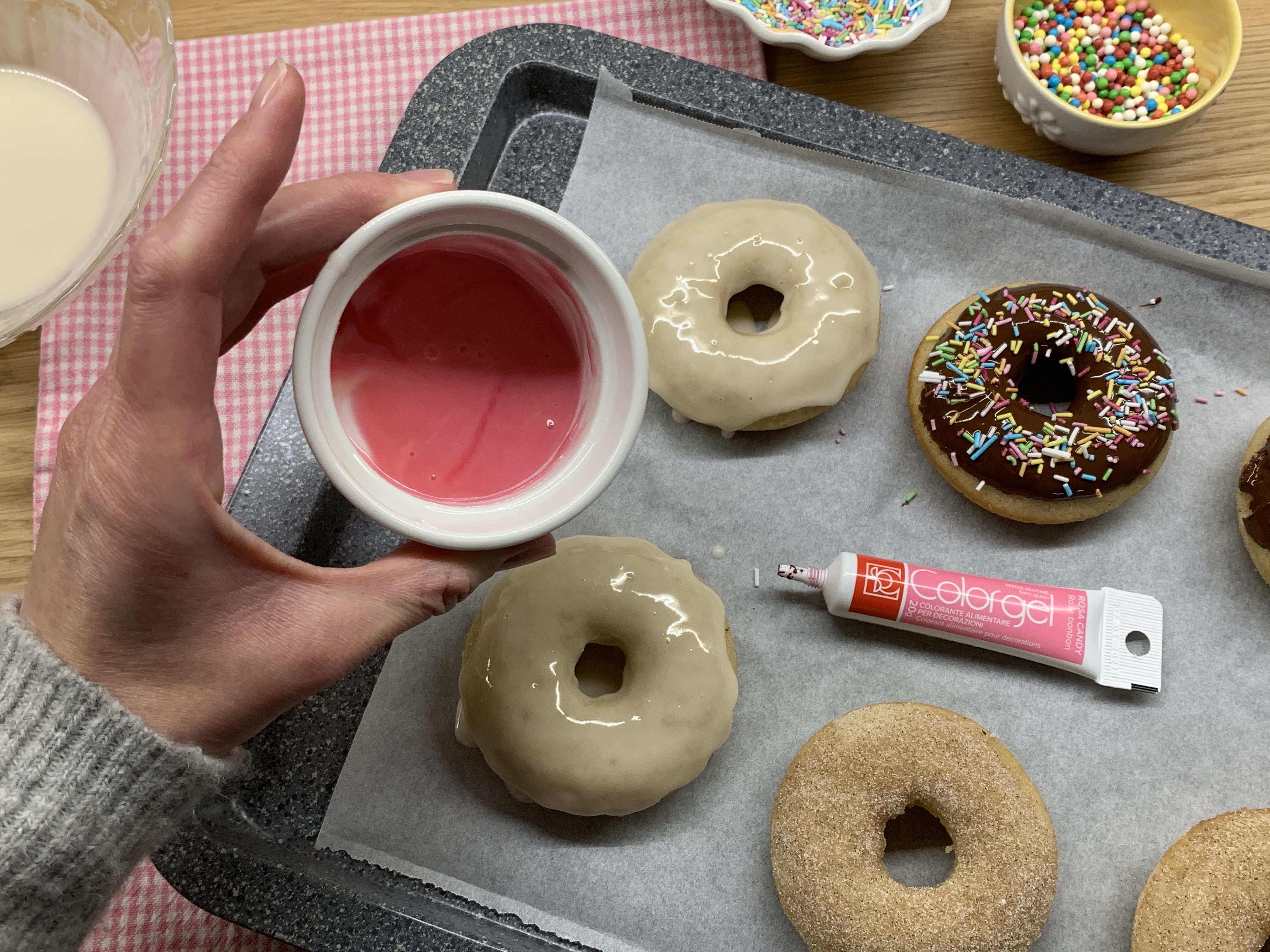 3. Colorare con il colorante in gel una parte della glassa se si desidera decorare il donut.[/recipe-directions]