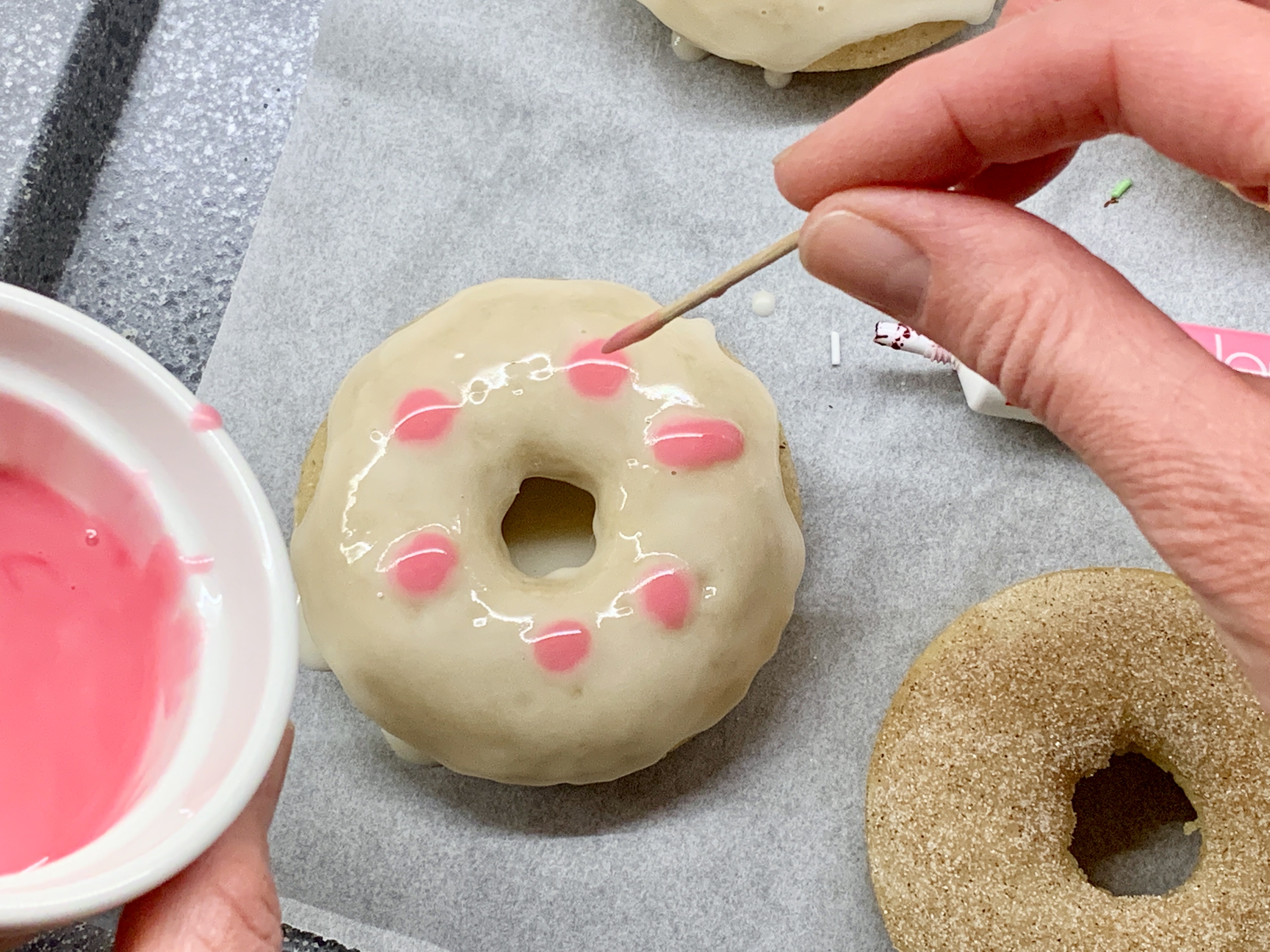 Se volete decorare i vostri donuts come ho fatto io, colorate una parte di glassa con il colorante alimentare e, aiutandovi con uno stuzzicadenti, lasciate cadere dei puntini di glassa tutt’attorno il donut. Infine tagliate con un unico movimento circolare ogni puntino nel centro sempre usando lo stuzzicadenti. Avrete formato tanti cuori.