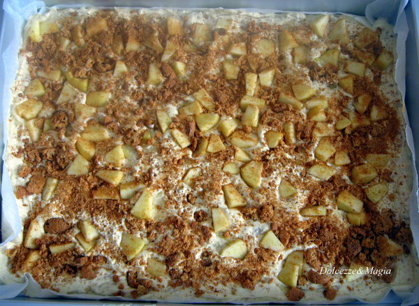 Prima di tutto tagliate le mele a cubetti piccoli e sbriciolate gli amaretti, poi accendete il forno a 180° e imburrate e infarinate una teglia 30×40. Io l’ho semplicemente ricoperta con un foglio di carta forno, è più veloce!!