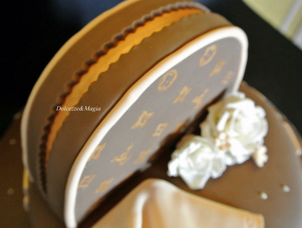 Preparo la borsetta rifacendomi a un libro di mrs Debby Brown, v’ imprimo i loghi vuitton che avevo preparato … a mano … e la borsa è pronta, ora non resta che montare la torta …