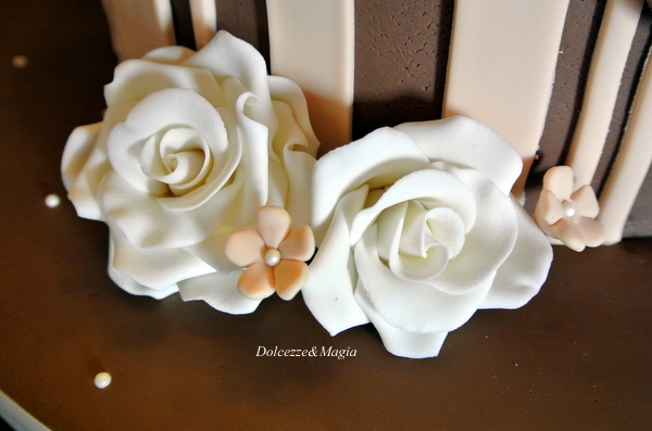 Nel frattempo pensavo alla struttura della torta. Avevo visto, sfogliando un libro, una bellissima torta a due piani sormontata di rose bianche e il piano inferiore aveva delle strisce di varie dimensioni che si alternavano tra loro di un delicato color crema. Tranne che per il colore decido che le strisce potevano fare al caso mio … “mi serve il vassoio di questa misura, il fiocco bianco attorno, le perle … e il colore marrone, ok tanto il marrone lo trovo facilmente” NON AVESSI MAI – MAI- MAI PRONUNCIATO QUESTE PAROLE!