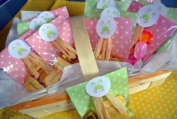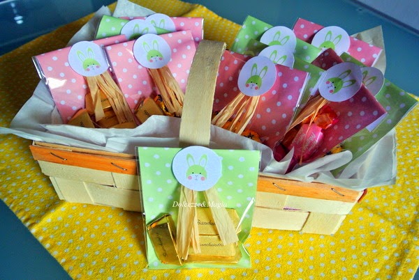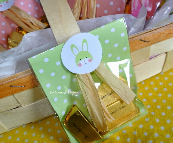 Così ho realizzato un piccolo cestino pasquale con sacchettini pieni di gianduiotti, uova di cioccolata e caramelle.