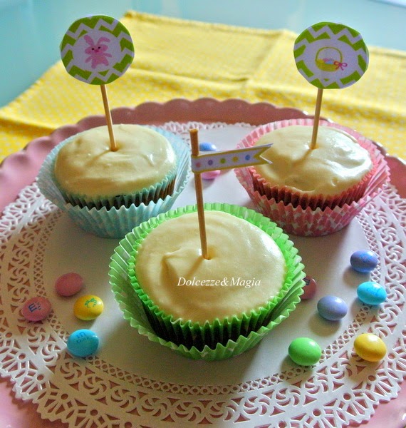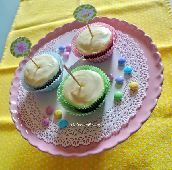 Io ho usato il cream cheese frosting per farcirli, ho preparato mezza dose perchè ho sostituito la philadelphia classica con quella di soia e il burro con la margarina, così li ho potuti mangiare anch’io, ma ovviamente queste sostituzioni sapevo già che avrebbero reso il frosting molto morbido, da spalmare e non da usare con una sac a poche.