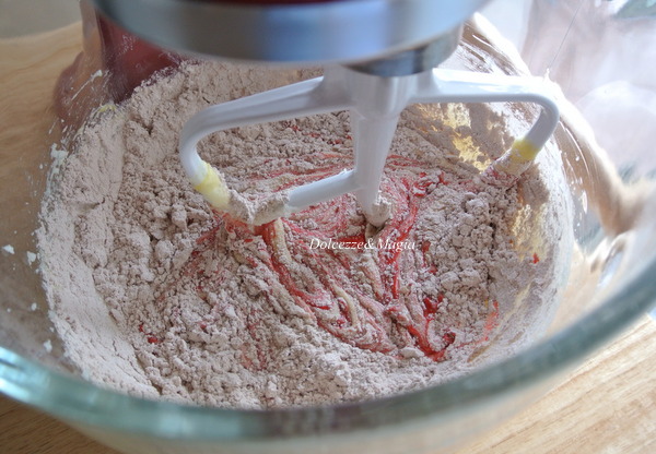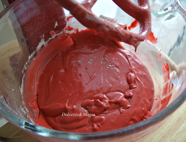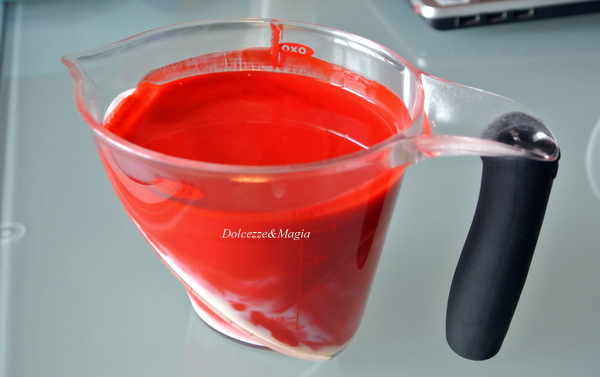 Sciogliete i due cucchiai di colorante rosso nel buttermilk/latticello e mettete anche questo da parte.