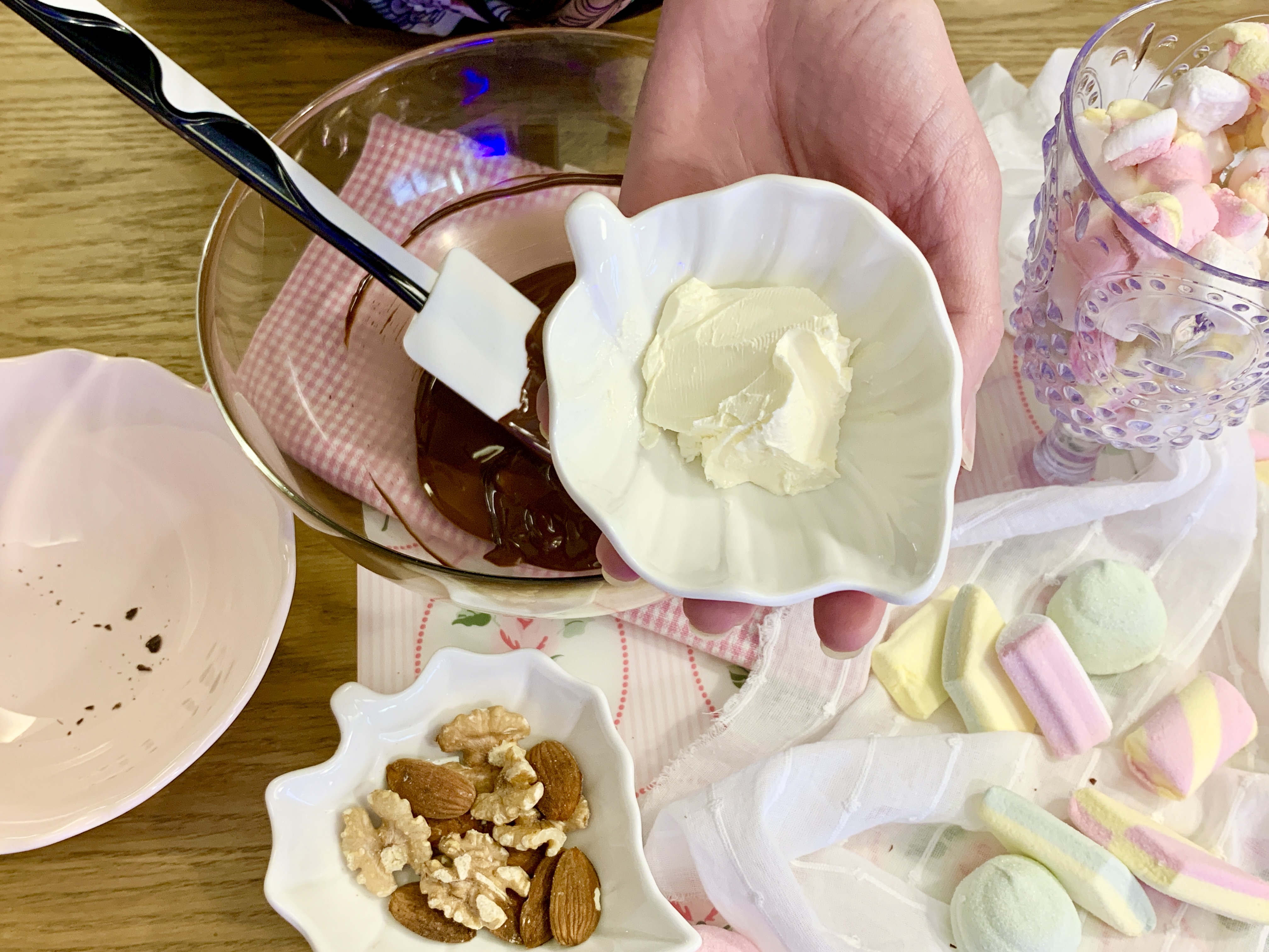 Realizzarli è facilissimo. Ci servono del cioccolato di buona qualità, il tipo che amiamo mangiare quando ci concediamo una pausa golosa. Marshmallows, meglio se colorati così i colori si vedranno quando taglieremo i quadrotti e l’effetto è molto grazioso. Frutta secca tostata, io ho usato mandorle e noci, ma voi potete scegliere quello che più vi piace, pistacchi, nocciole, quello che preferite. Infine del burro, vegetale per mantenere vegan la preparazione, o vaccino se lo preferite.