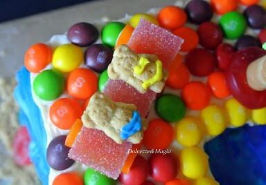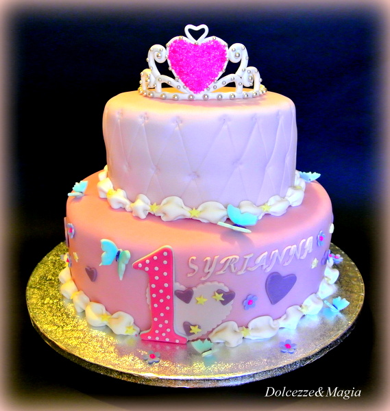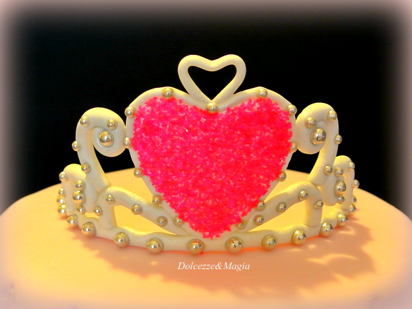 Mrs Shantel desiderava per la sua bambina qualcosa che richiamasse il tema della principessa e della corona. Lasciandomi libera nella scelta dei decori, l’unica richiesta specifica era stata quella di ricreare nella torta, se possibile, i colori del set di piatti e bicchieri che avrebbe usato.
