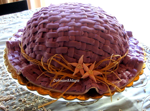La copertura è fatta di mmf, royal icing applicata con la Basketwave Tecnique e i fiori sono di pasta di zucchero.